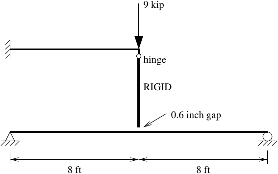 The following assertions verify that both reactions of the simple span are equal to 2.5 kip (the “back of the book” answer) and that the difference in deflection between the free end of the cantilever and the middle of the simple span is equal to the gap distance.