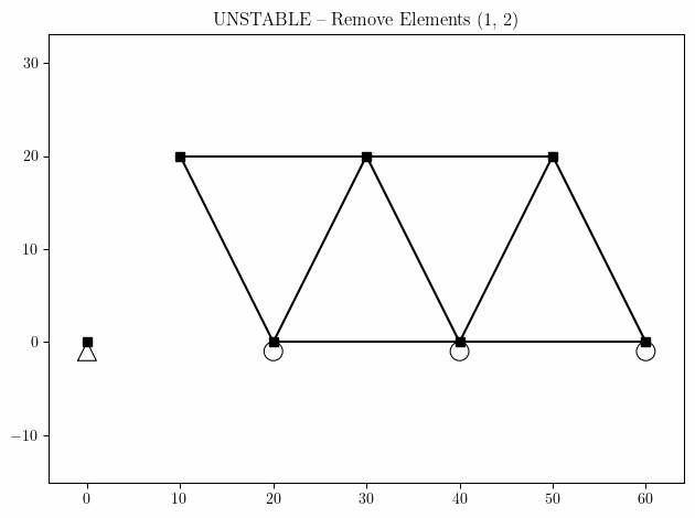 Now we can find all combinations of DSI truss elements that could be removed from the model and iterate through the combinations. At each iteration, remove the elements in the combination, do a stability check via eigenvalue analysis, then restore those elements before the next iteration.