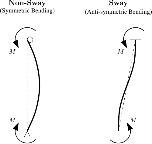\[{\bf k}_b = \frac{EI}{L} \left[ \begin{array}{cc} 4 & 2 \\ 2 & 4 \end{array} \right] = \frac{2EI}{L} \left[ \begin{array}{cc} 1/2 & -1/2 \\ -1/2 & 1/2 \end{array} \right] + \frac{6EI}{L} \left[ \begin{array}{cc} 1/2 & 1/2 \\ 1/2 & 1/2 \end{array} \right]\]These modes of bending correspond to non-sway and sway conditions.